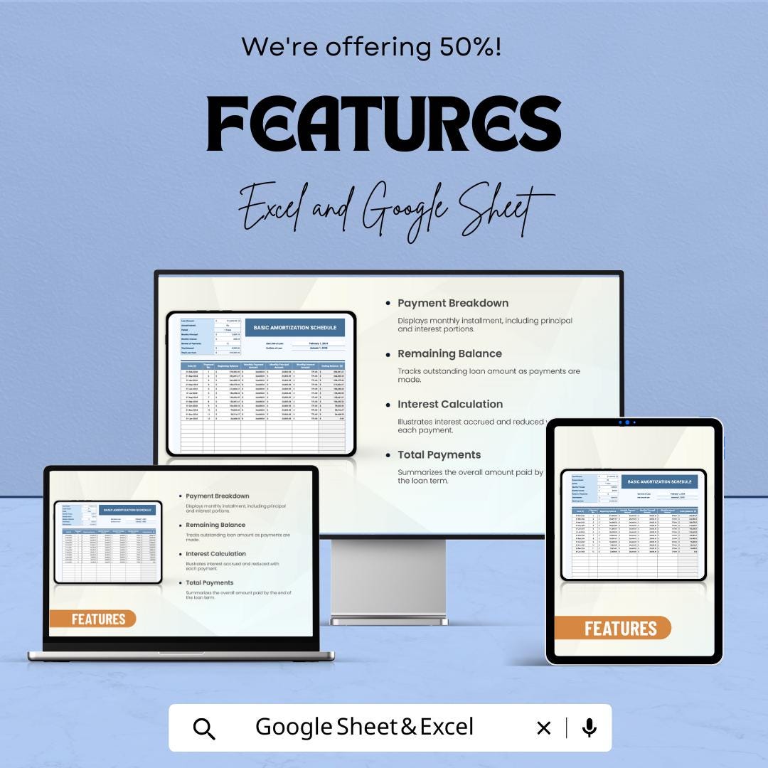 Take control of your financial future with this Basic Amortization Schedule Template! Available for Excel and Google Sheets, this easy-to-use, fully customizable template is designed to help you manage loan repayments, track your outstanding balance, and plan your financial goals.