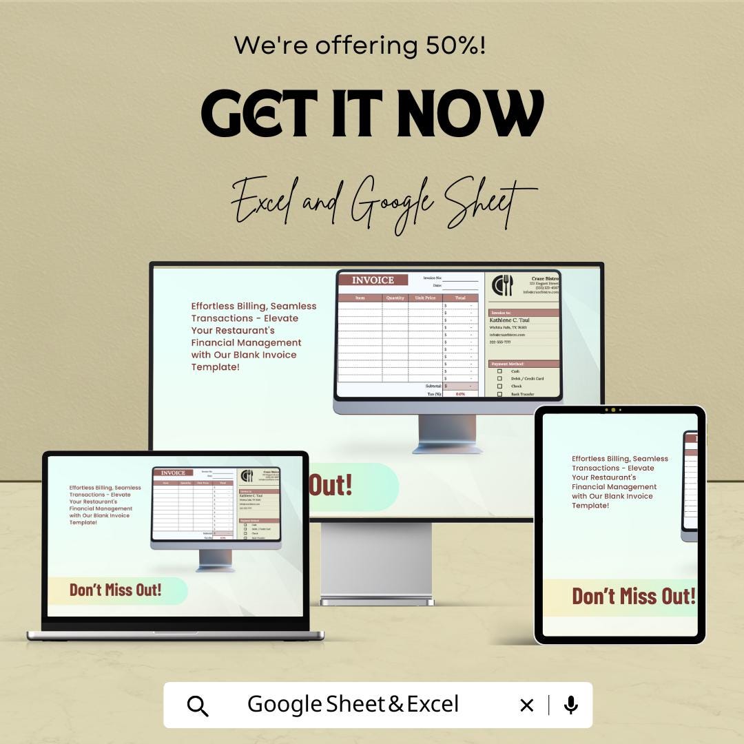 Blank Restaurant Invoice Template - Excel and Google Sheets | Customizable Billing | Tax & Payment Method Integration