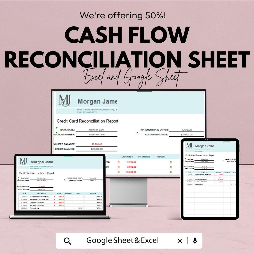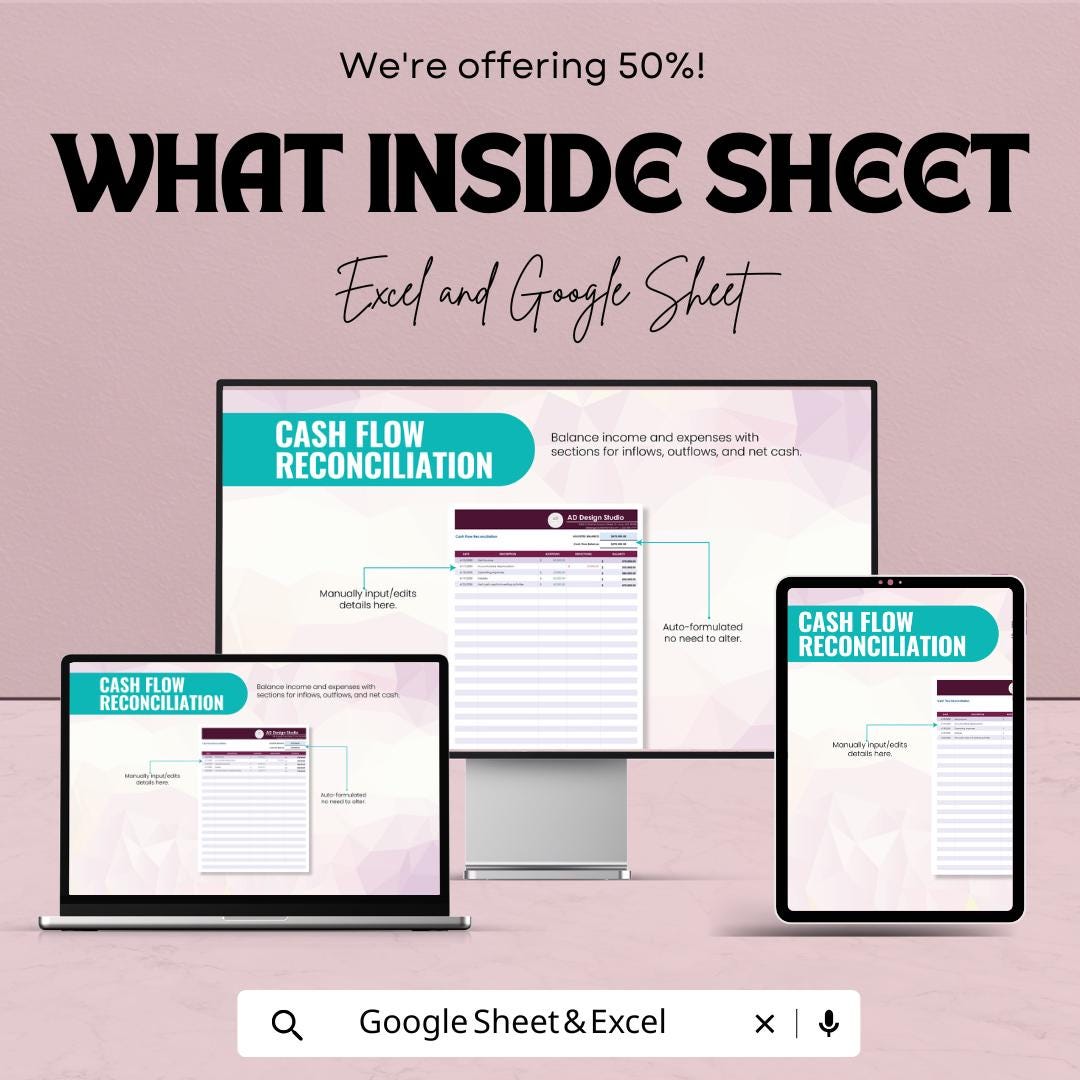 Cash Flow Reconciliation Sheet for Excel and Google Sheets | Financial Tracking Template | Balance Income, Expenses & Net Cash |