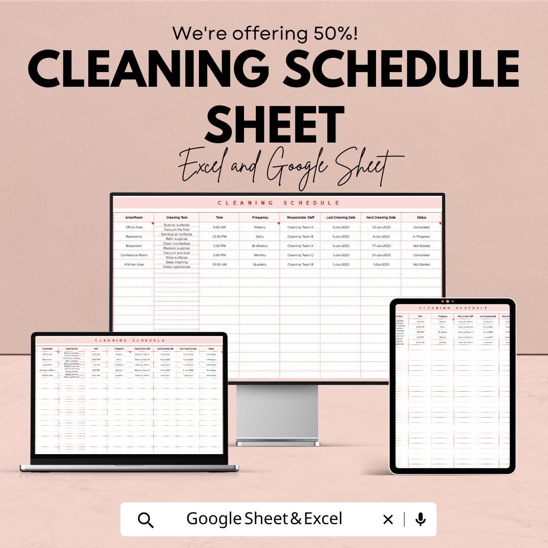 Cleaning Schedule Sheet - Excel and Google Sheets Template | Customizable Cleaning Task Planner | Easy Household & Office Schedule