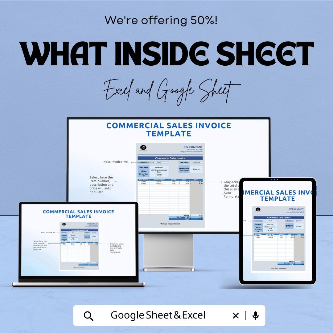 Commercial Sales Invoice Template - Excel & Google Sheet | Customizable Invoice Tracker for Businesses | Professional Invoice Sheet |