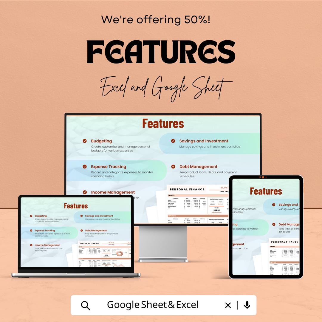 Complete Personal Finance Sheet - Excel and Google Sheets Template for Budgeting, Tracking Income & Expenses - 50% Off