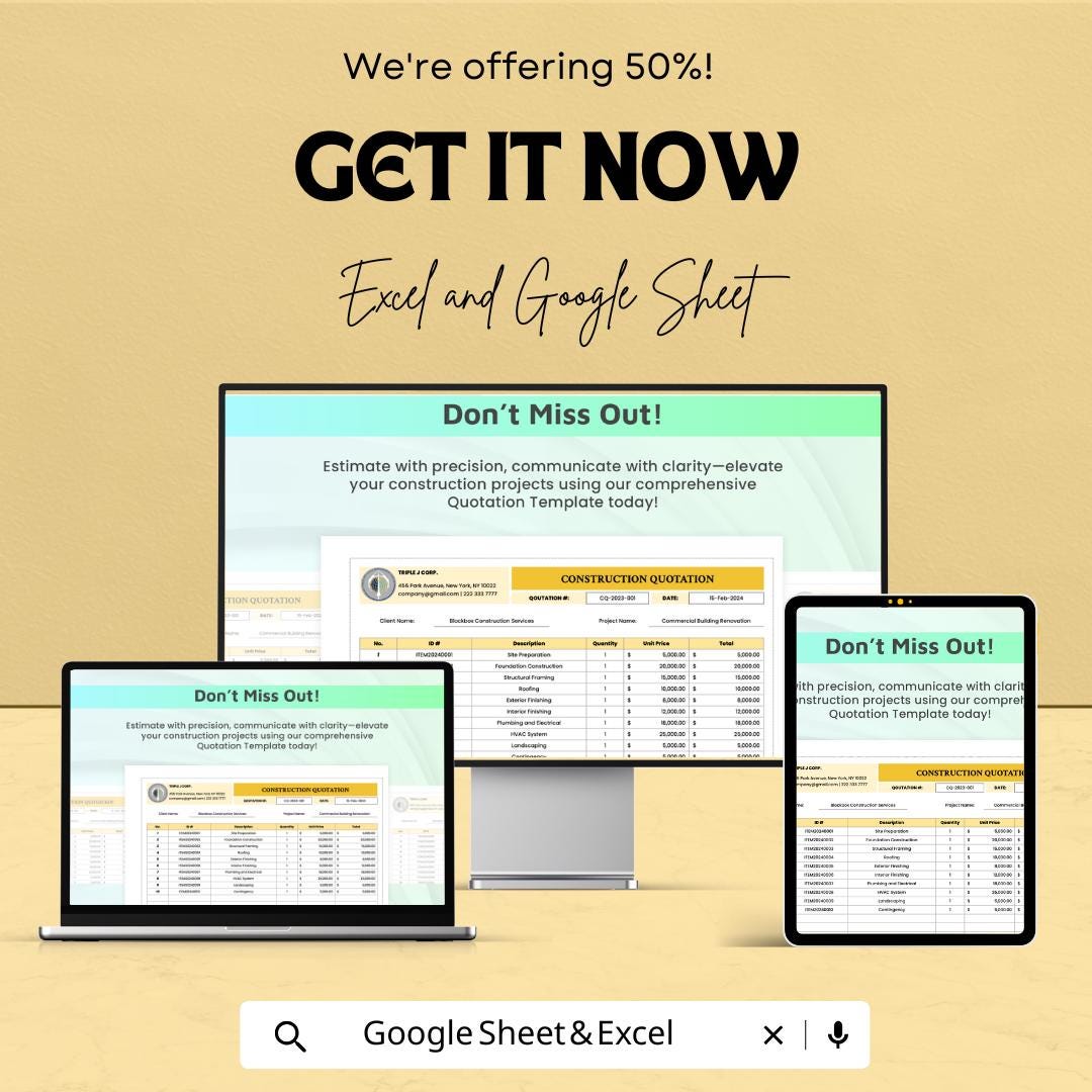 Construction Quotation Template for Excel & Google Sheets – 50% Off – Professional Project Estimation Tool