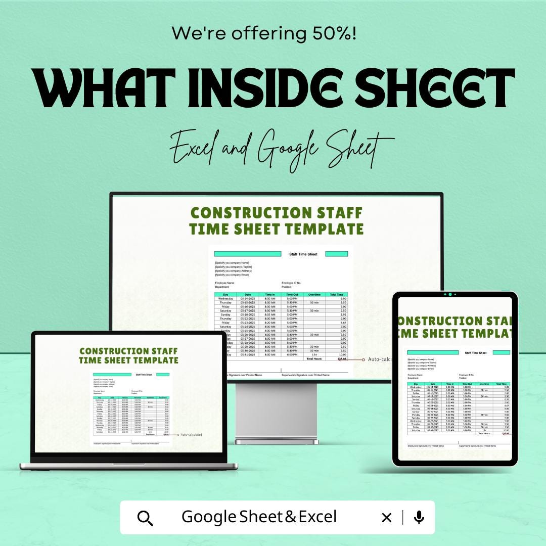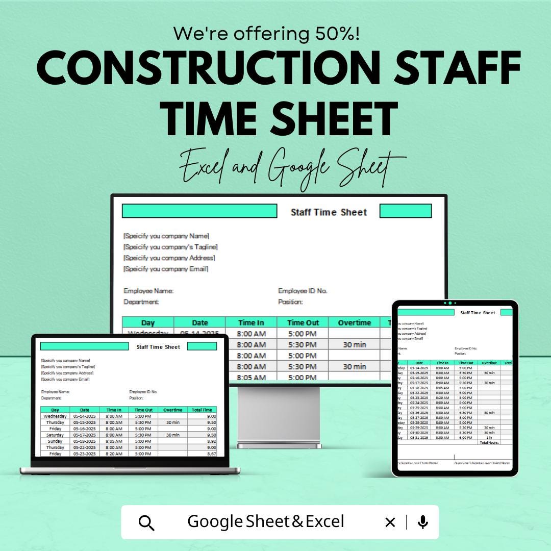 Construction Staff Time Sheet Template | Excel & Google Sheets | Track Hours, Overtime, and Payroll for Construction Projects
