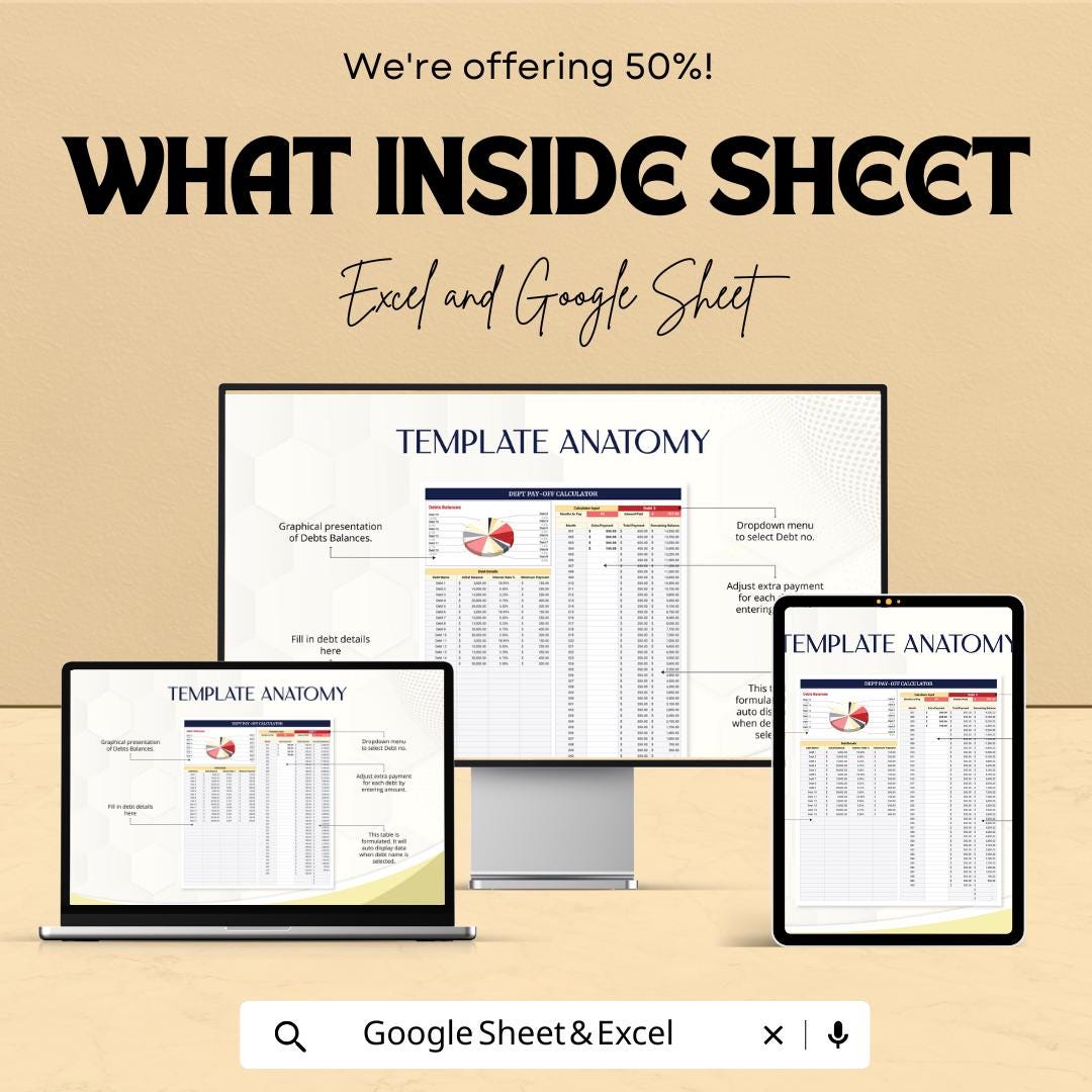 Debt Pay-Off Calculator Sheet – Excel & Google Sheets Template for Debt Management – 50% Off