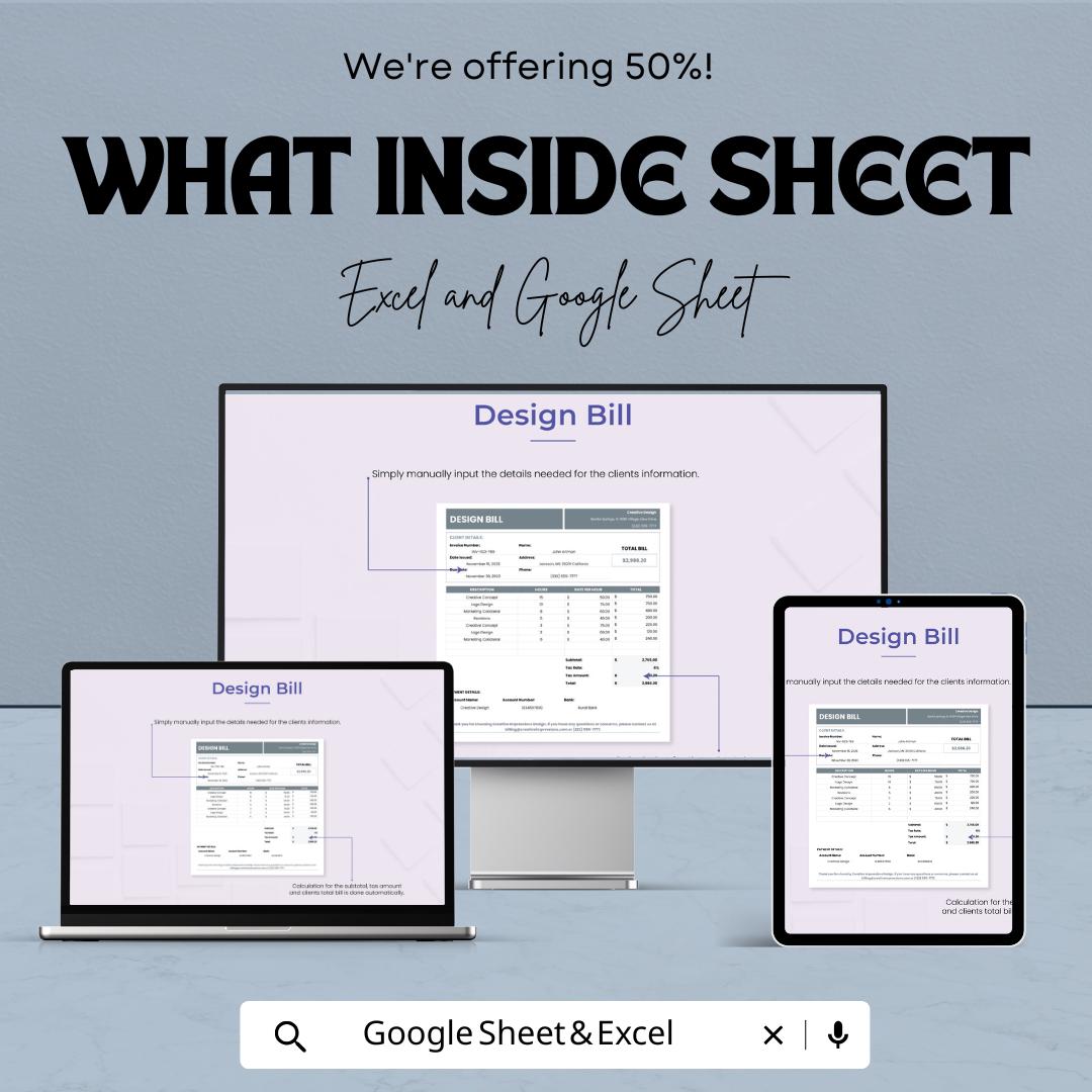 Design Bill Template - Excel & Google Sheets, Client Invoice, Creative Billing, Project Bill Tracker, Professional Design Billing Sheet,