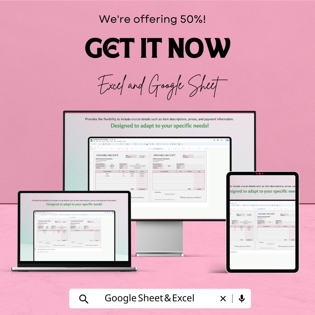 Editable Receipt Sheet - Customizable Excel & Google Sheets Template for Professional Receipts