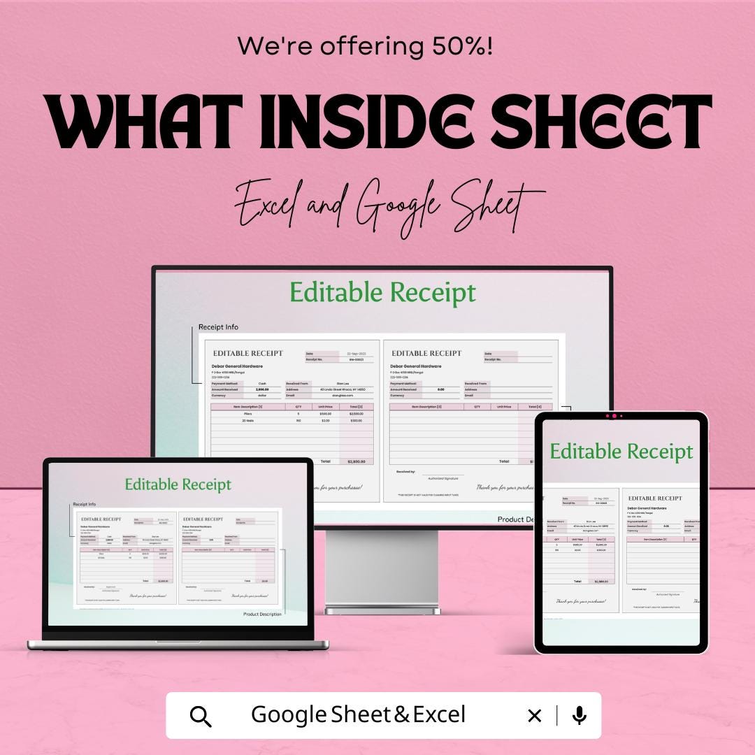 A fully editable Receipt Sheet in Excel and Google Sheets formats.
