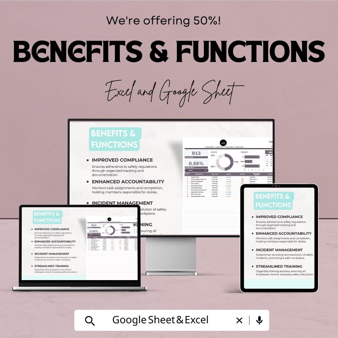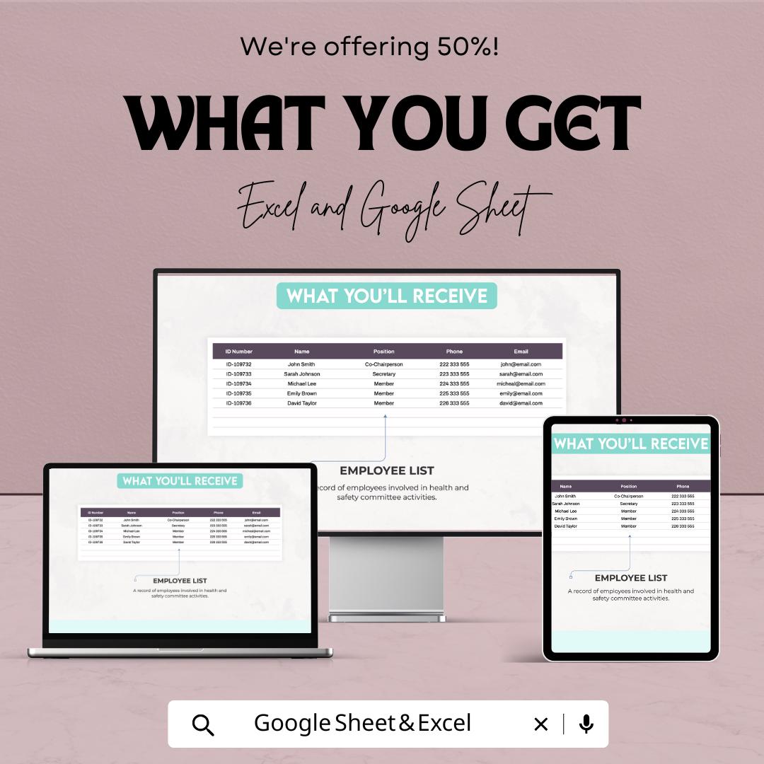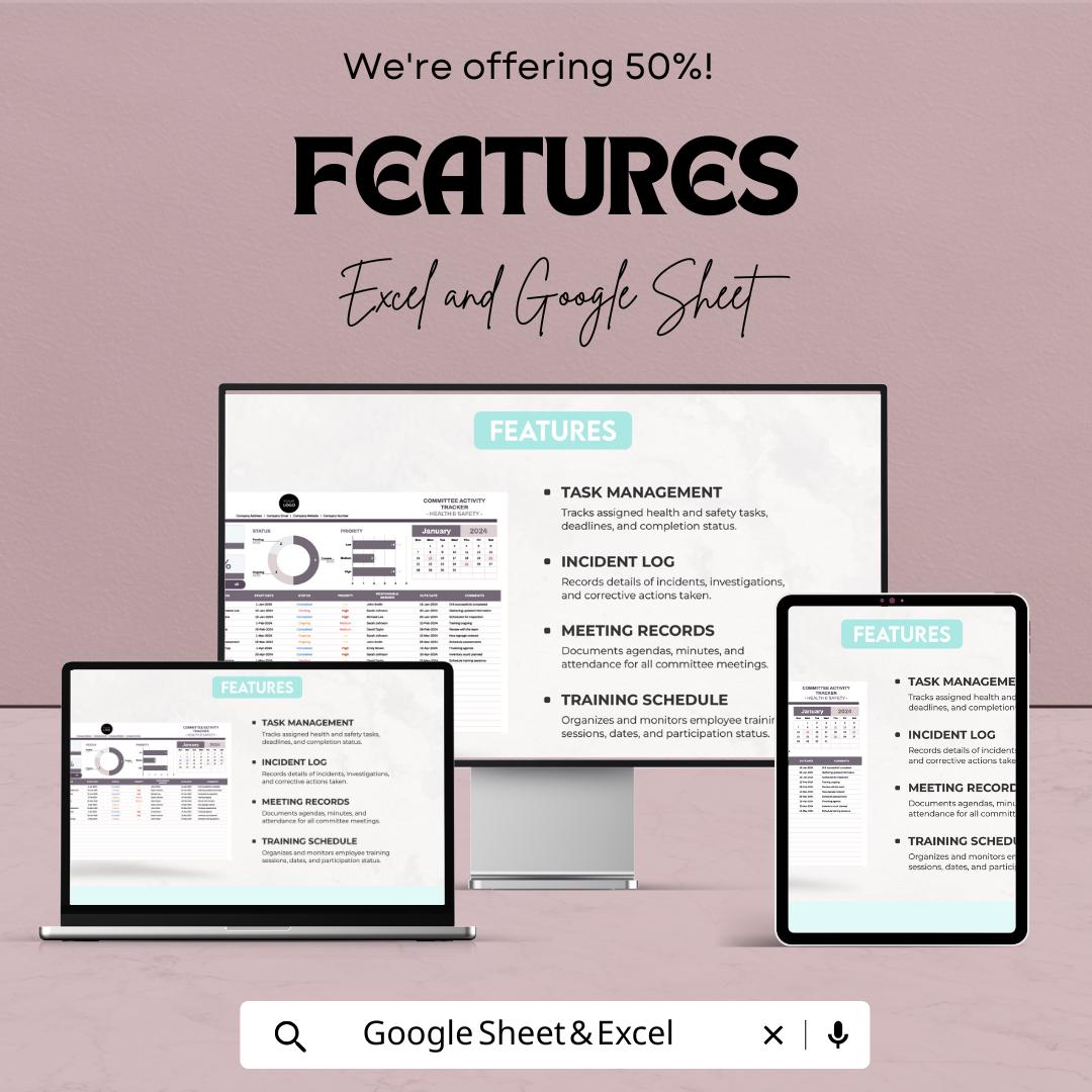A fully editable Health & Safety Committee Activity Tracker Sheet in both Google Sheets and Excel formats.