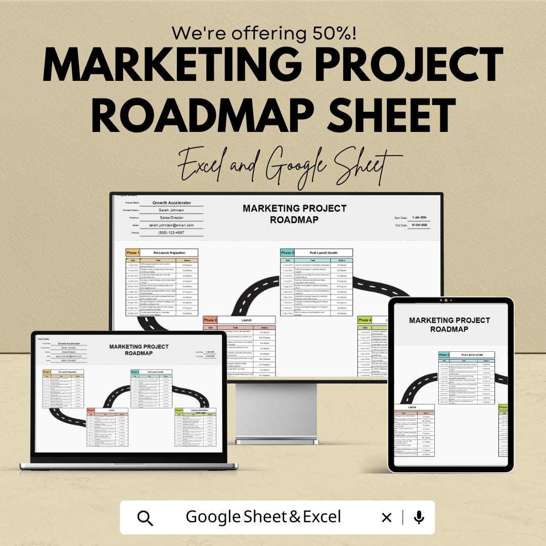 Marketing Project Roadmap Sheet | Excel & Google Sheets Template | Campaign Planning, Goal Setting, Milestone Tracking | 50% Off