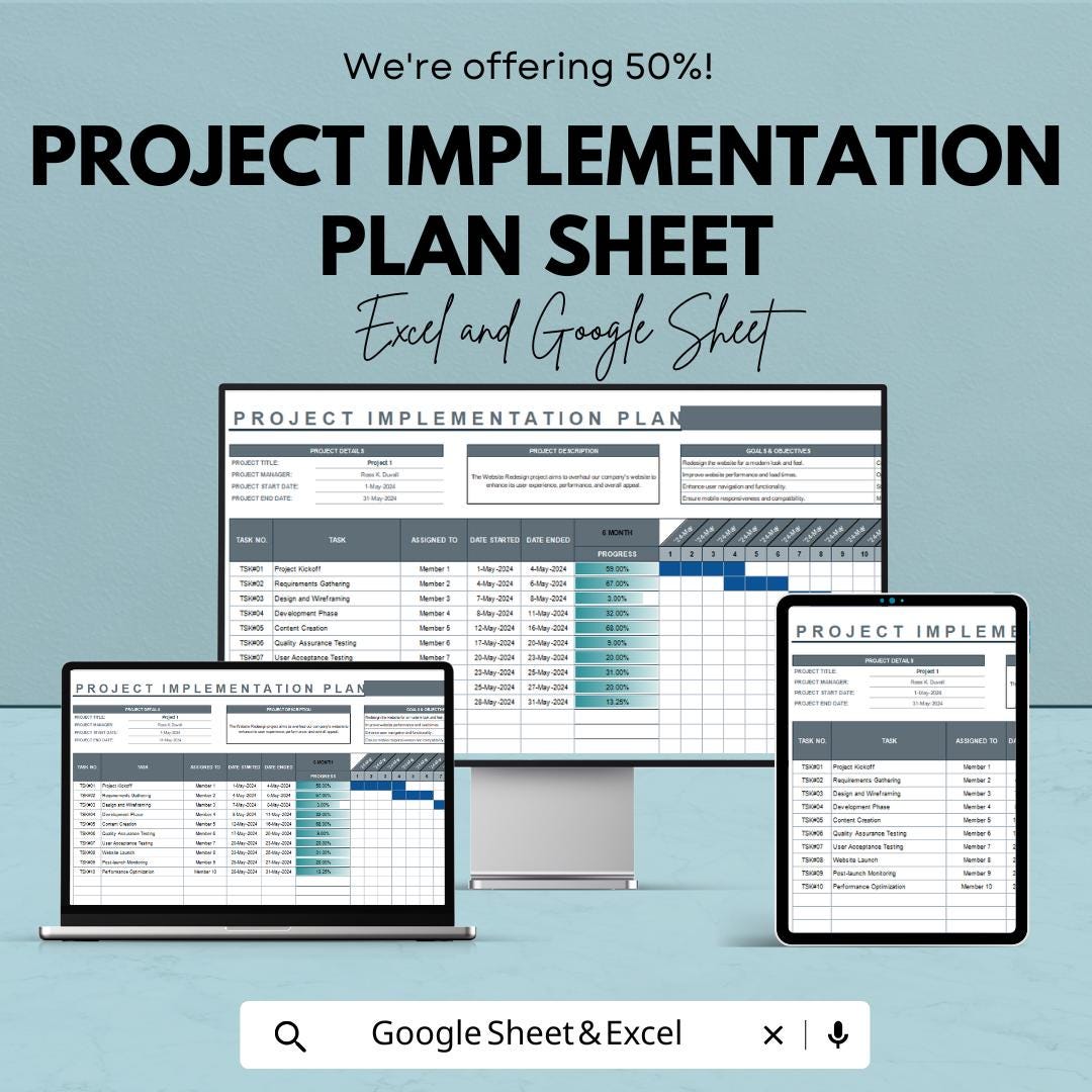 Project Implementation Plan Sheet – Editable Excel and Google Sheets Template for Project Management, Tracking & Reporting