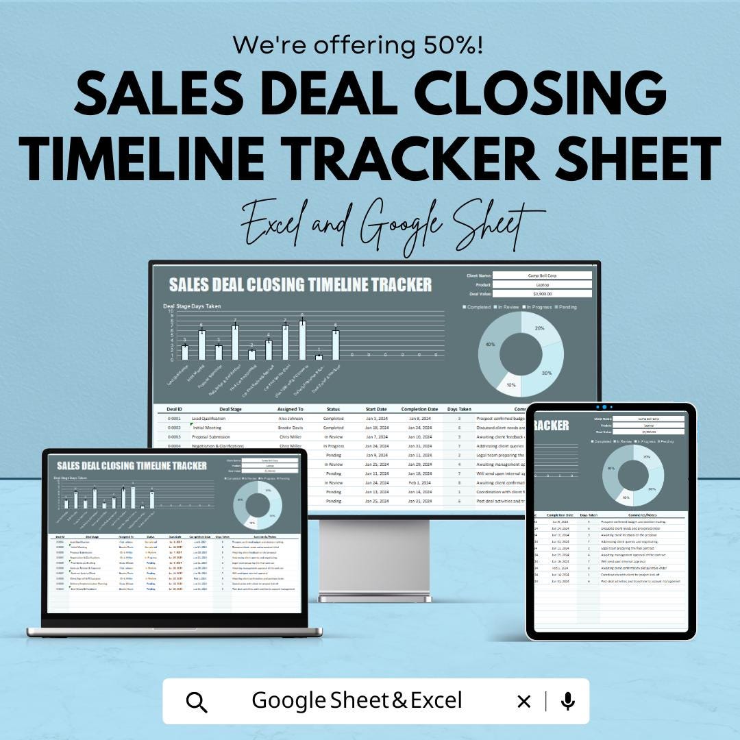 Maximize your sales efficiency with the Sales Deal Closing Timeline Tracker Sheet. This powerful template, available in Excel and Google Sheets, helps you track the progress of your sales deals from initial contact to closure. Whether you're a sales professional, team leader, or business owner, this tool will help you manage multiple deals effectively and close them on time.