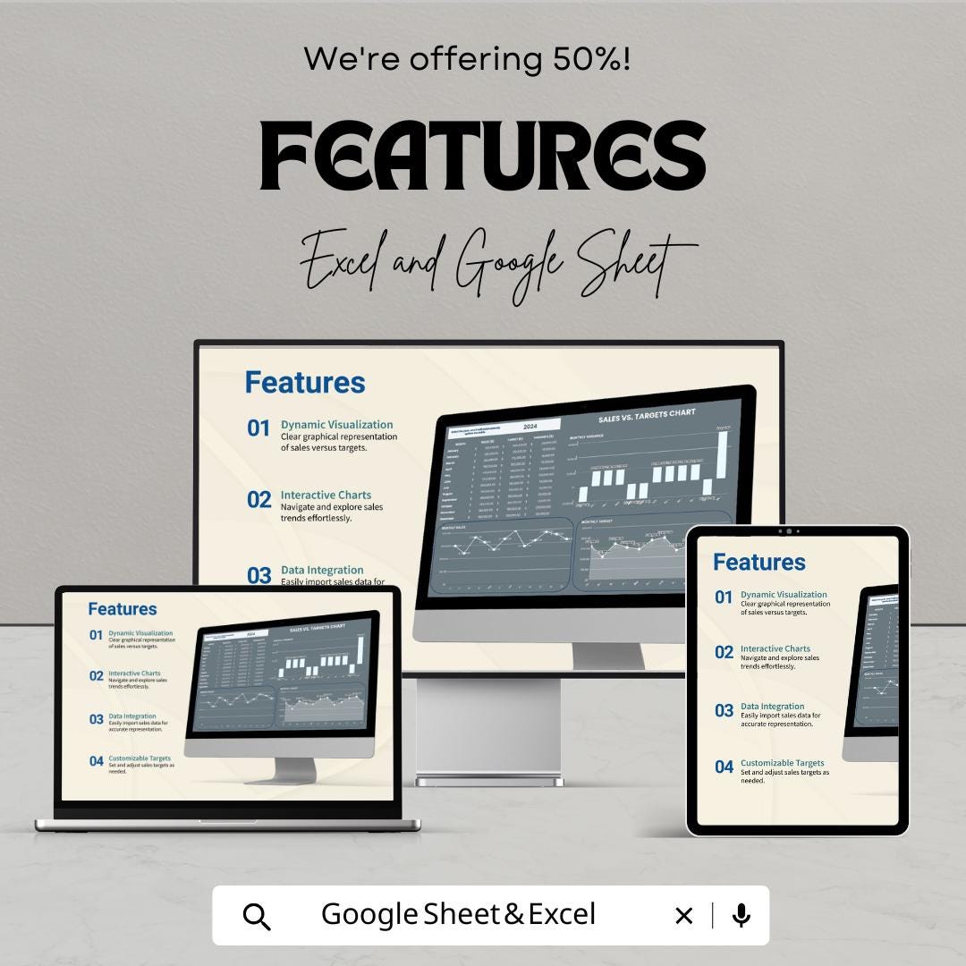 Sales vs. Targets Chart Layout: Pre-configured charts to compare actual sales against targets, broken down by month, quarter, or year.