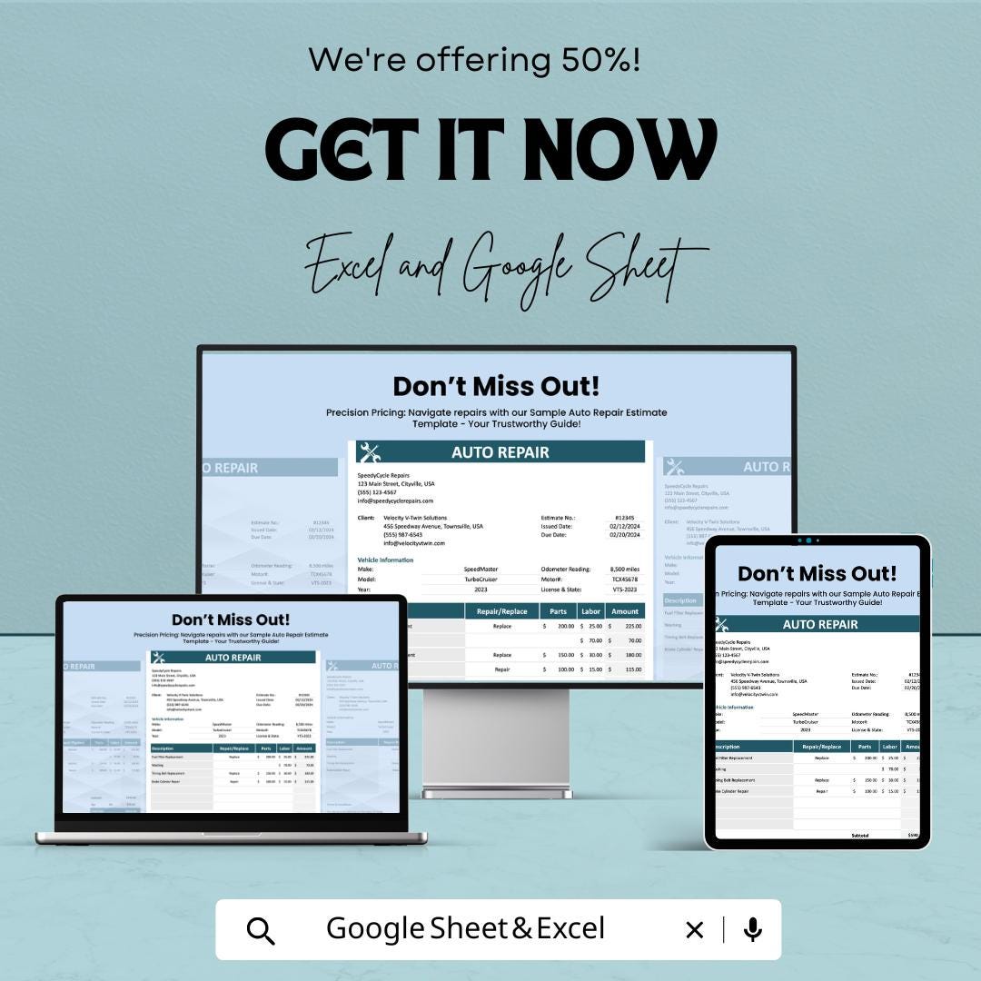 Sample Auto Repair Estimate Sheet | Excel & Google Sheet Template | Auto Repair Service Invoice | Customizable Vehicle Repair Estimate