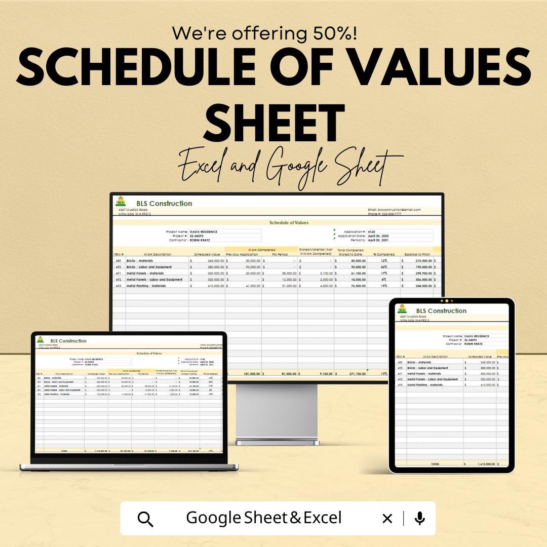 Schedule of Values Sheet | Excel & Google Sheets Template | Construction Project Cost Tracker