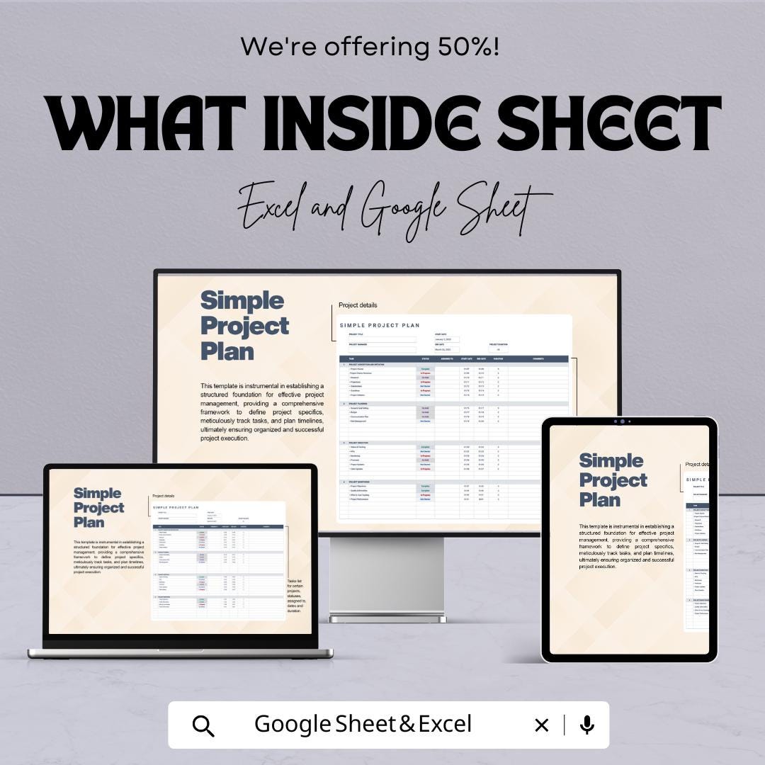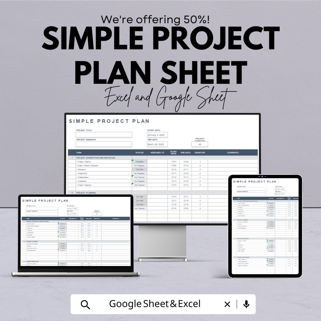 Simple Project Plan Sheet | Excel and Google Sheets Template | Project Management Planner | Task Tracker | Milestone & Budget Planner |
