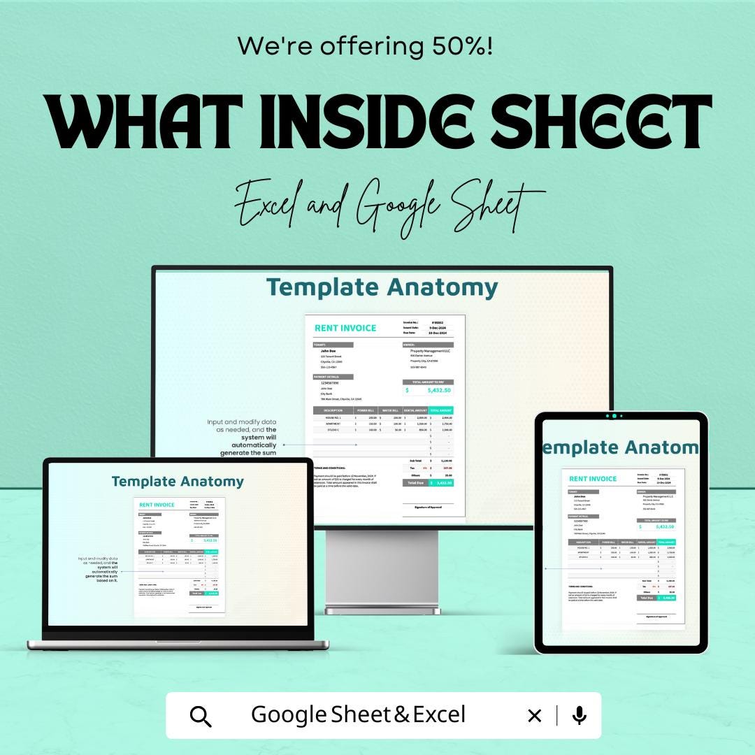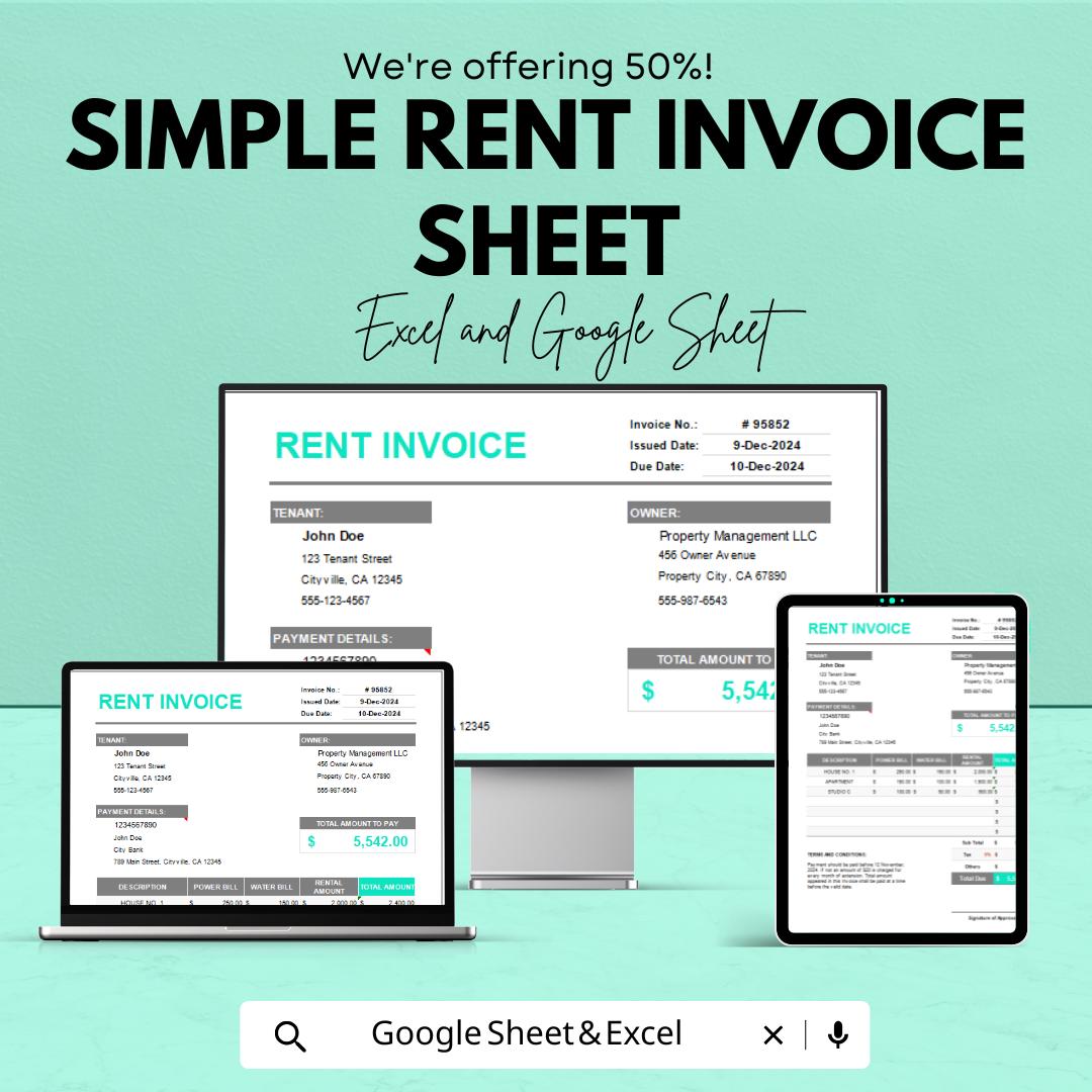 Simple Rent Invoice Sheet | Excel & Google Sheets Template | Rent Billing Template