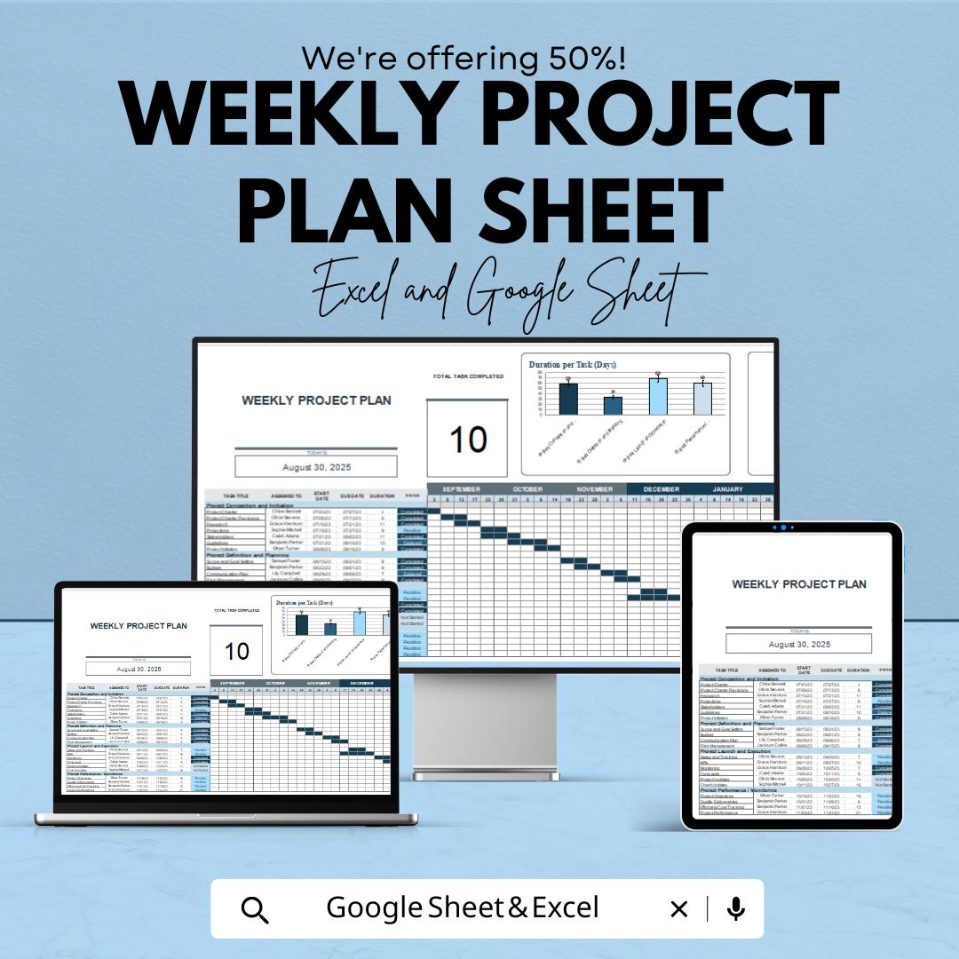 Weekly Project Plan Template Sheet | Excel and Google Sheets | Project Management Tool | Task Scheduling & Tracking Template
